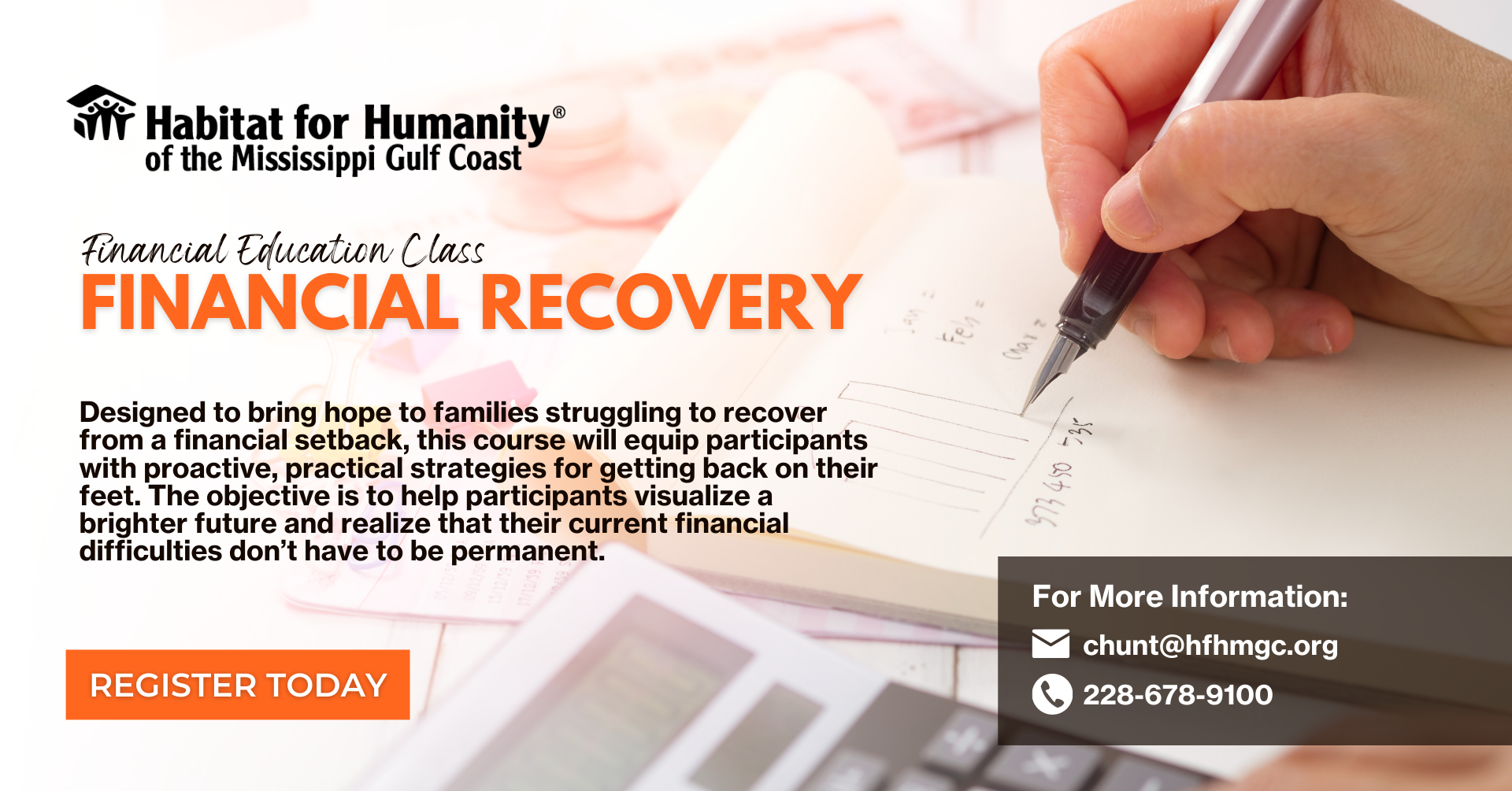 Habitat for Humanity MS Gulf Coast currently offers various financial education curriculums. All classes and coaching are currently offered free of charge, and all courses are open to the public, but registration is required. This financial education class is called "Financial Recovery." Designed to bring hope to families struggling to recover from a financial setback, […]