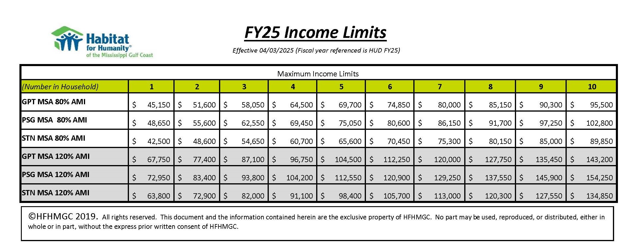 While Habitat MS Gulf Coast’s programmatic requirements allow for the eligibility of households with income up to 120%, some of the home buyer assistance programs and other funders with whom we partner have lower income limits (typically 80% AMI). In such cases, certain home buyer assistance funds or properties may not be available to households between 80% and 120% AMI.